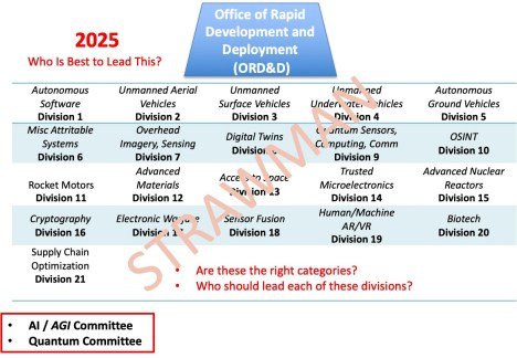 The Trump administration should create the Office of Rapid Development and Deployment (ORDD) modeled after the WW II’s Office of Science, Research and Development (OSRD.) This could build on the existing Defense Innovation Unit which is already taking many of the right steps, albeit with dramatically greater scale and autonomy as described below.