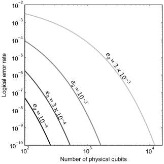 The logical qubit error rate P_L is P_L = 0.03 (p/p_th)^((d+1)/2), where p_th ~ 0.6% is the error rate threshold for surface codes, p the physical qubit error rate, and d is the size of the code, which is related to the number of the physical qubits: N = (2d – 1)^2.