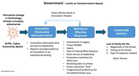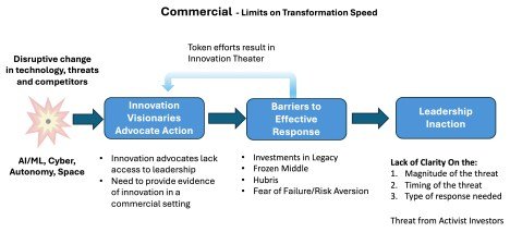 I’ve been working with a large organization whose very existence is being challenged by an onslaught of technology (AI, autonomy, quantum, cyberattacks, access to space, et al) from aggressive competitors, both existing and new. These competitors are deploying these new technologies to challenge the expensive (and until now incredibly effective) legacy systems that this organization has built for decades. (And they are doing it at speed that looks like a blur to this organization.) But the organization is also challenged by the inaction of its own leaders, who cannot let go of the expensive systems and suppliers they built over decades. It’s a textbook case of the Innovators Dilemma.