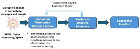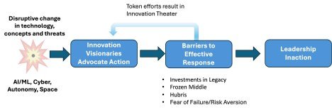 Meanwhile because their budget is a zero-sum game, they starve innovators of funds and organizational support for deployment of disruptive new concepts at scale. The result is “innovation theater.” In the commercial world this behavior results in innovation demos but no shipping products and a company on the path to irrelevance or bankruptcy. In the military it’s demos but no funding for deployments at scale.