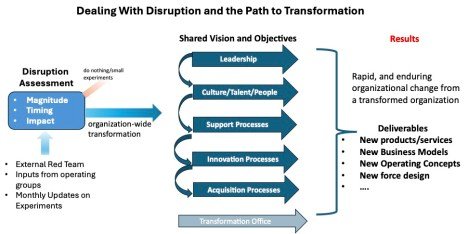 The answer starts at the top. Responding to disruption requires action from senior leadership: e.g. the CEO, board, Secretary, etc. Fearful that a premature pivot can put their legacy business or forces at risk, senior leaders delay deciding – often until it’s too late.